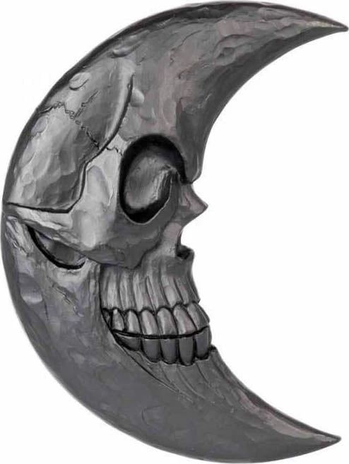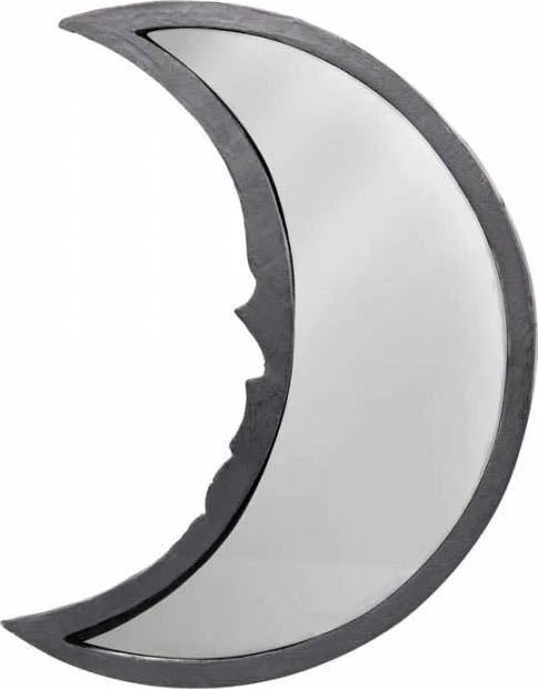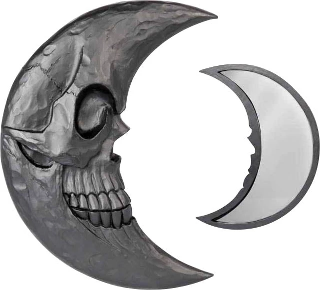 A moon shaped mirror with intricate skull detail. Hand finished in the finest quality black resin.