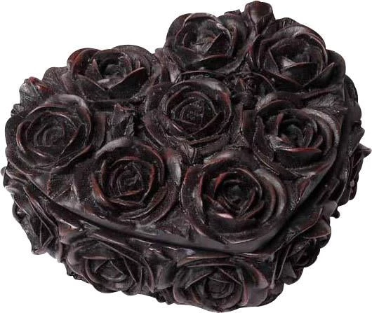 Matte Black finished resin trinket box, heart shaped with rose decoration.