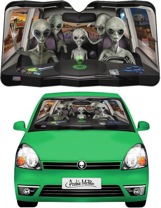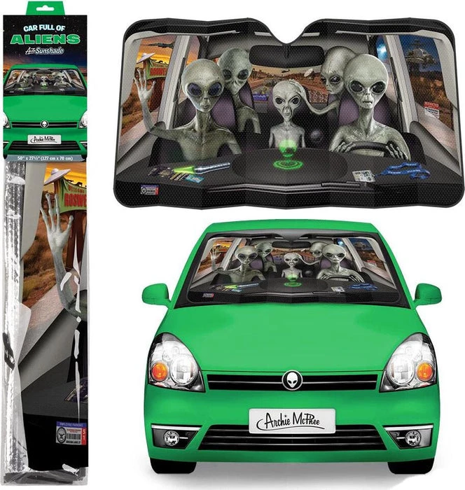 This Car Full of Aliens Auto Sunshade makes it look like youβre escaping from Area 51! Through the advanced, futuristic power of shade, this sunshade will allow you to park in the sun without your interior turning into a warp core meltdown. Features a group of gray aliens, not their mortal enemies β the lizard people, escaping from a secret government lab. this sunshade is big enough for most cars. It protects, cools, and blocks out UV rays. Includes two suction cups for simple installation. Folds for easy storage. Metallized polyester laminate.