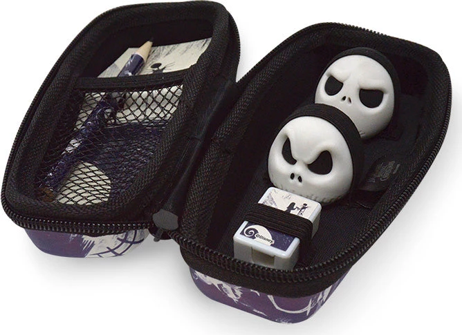 A zipped Mini Stationery Case which contains a mini pencil, mini notepad, two 3D Jack Skellington head shaped erasers and a pencil sharpener.