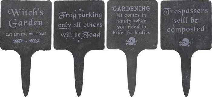 Sayings include; ‘Witch’s Garden: Cat lovers welcome’, ‘Frog Parking Only: All others will be toad’, ‘Gardening: It comes in handy when you need to hide the bodies’ and ‘Trespassers will be composted’.ย