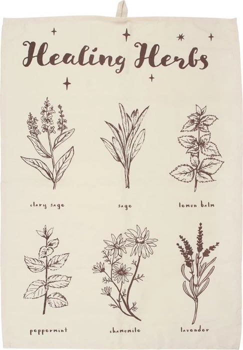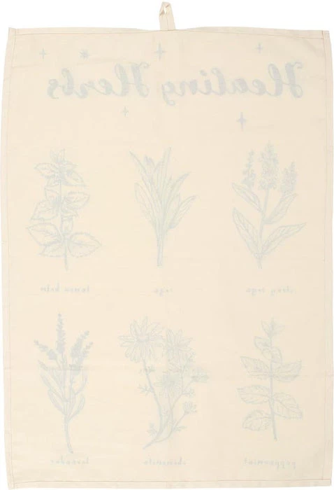Memorise healing herbs with this tea towel featuring beautiful illustrations of herbs commonly used for their healing properties. Designed in neutral shades to compliment any kitchen.