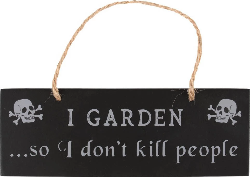 This humorous hanging sign features ‘I garden… so I don’t kill people’ text accented by skulls and crossbones. A truly unique gift for nontraditional gardeners.ย