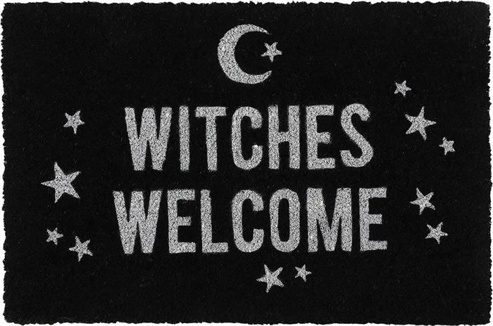 A Black coir doormat with printed ‘Witches Welcome’ text surrounded by a crescent moon and stars. Makes a fun welcome at the front door of any witch’s home.