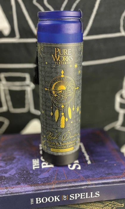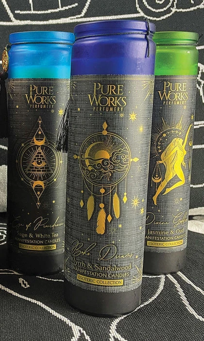 Encourage calmness within your space with the Esoteric Manifestation Myrrh & Sandalwood Tall Candle. Myrrh and Sandalwood has been used for years in aromatherapy to lift negative moods, promote calmness and improve sleep quality. It is a great addition to any household or altar.