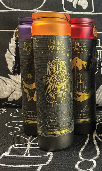 Ground yourself with the Esoteric Manifestation Patchouli & Orange Tall Candle. Patchouli and orange has been used for years in aromatherapy to relieve stress or anxiety and to uplift moods. It is a great addition to any household or altar.