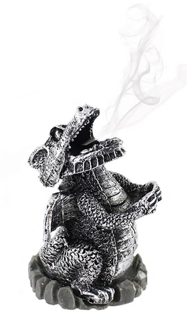 A silver-coloured resin dragon cone holder. Light a cone and watch it burn inside him and watch the smoke billow out of his mouth like a real dragon! Aw, so cute.