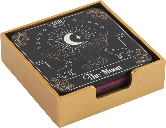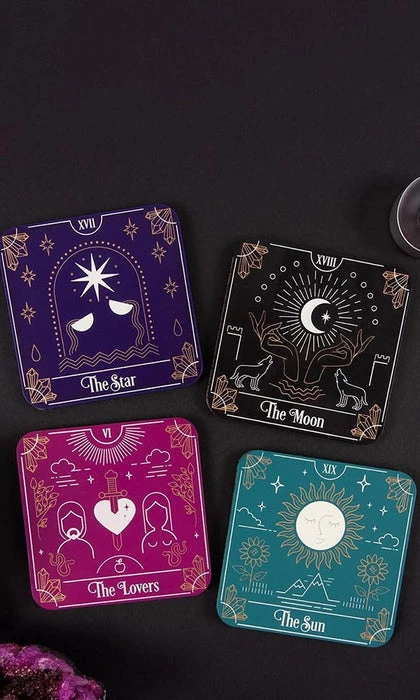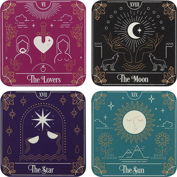 A set of four coasters in mystical tarot card designs. Each coaster features a modern illustration of classic cards; The Star (purple), The Sun (teal), The Moon (black) and The Lovers (burgundy). MDF with a cork backing to prevent slipping and comes in a matching gold tone holder.ย