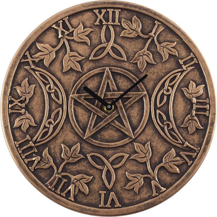 Beautifully crafted terracotta clock featuring a triple moon design by artist Lisa Parker. The clock has a bronze painted effect and requires 1 AA battery