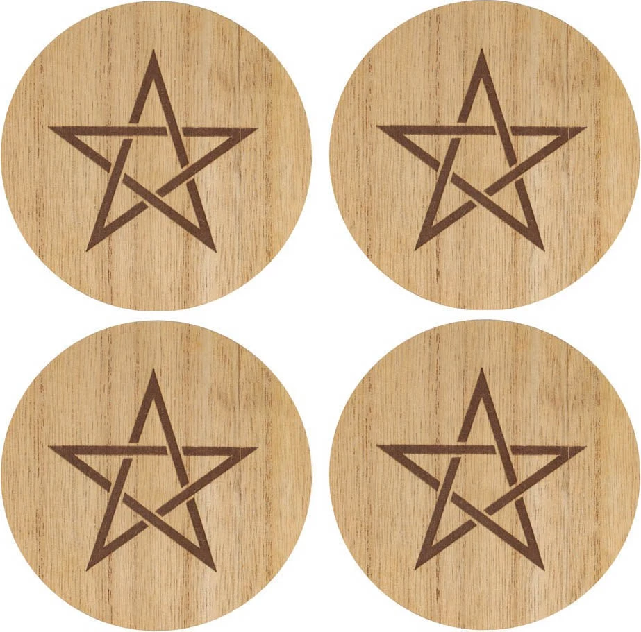 Set of four round wooden coasters engraved with a pentagram design.ย
