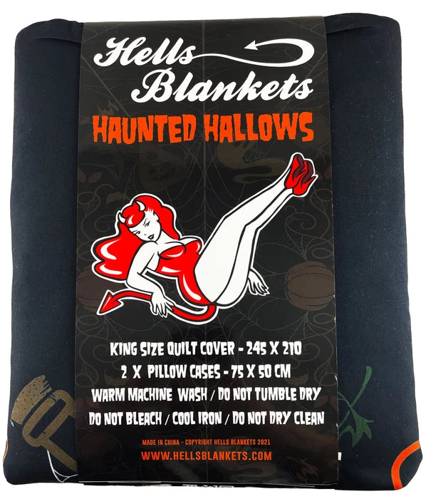The Haunted Hallows Quilt Set brings spooky and macabre vibes to the bedroom. Featuring an all over Halloween inspired design – perfect for anybody who likes to doze on the deadly side!