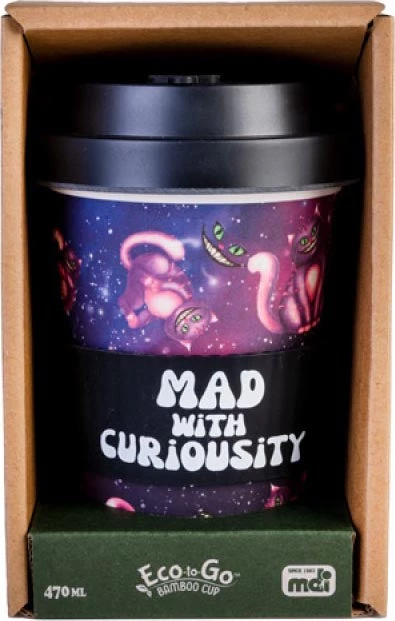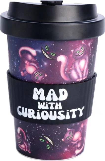 Matching black anti-spill lid and protective silicone band with ‘Mad With Curiosity’ text