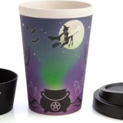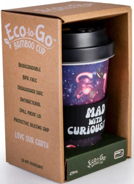Eco-friendly travel cup made from bamboo featuring grinning cats with bright green eyes on a cosmic background!