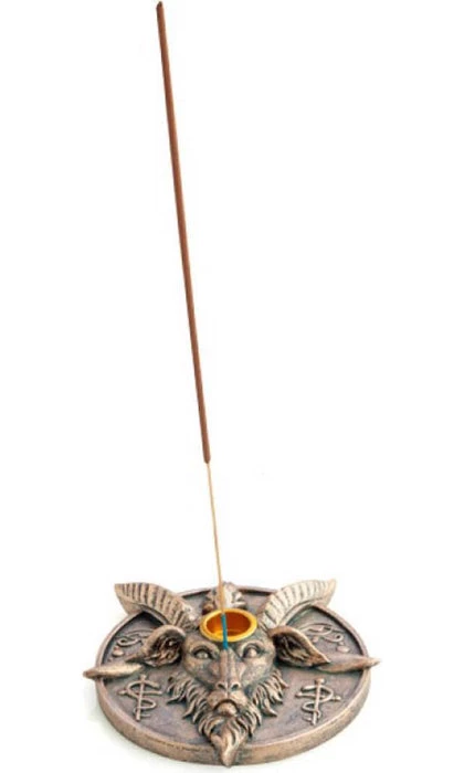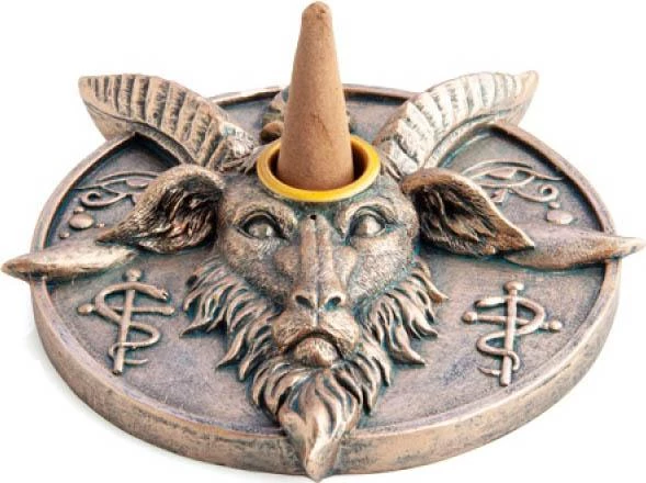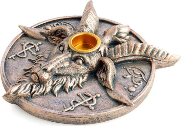 Bronze-look incense burner and candle holder that features a bold Baphomet design between the Eyes of Horus & Rod of Asclepius icons