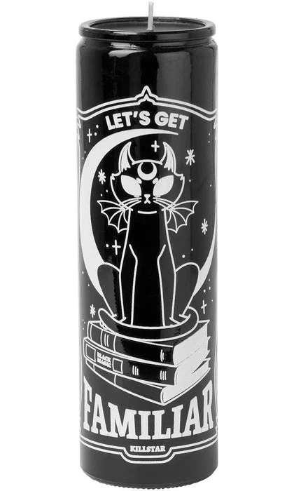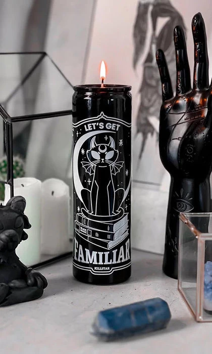Brighten your crypt with the βFamiliarβ Candle. Crafted in a glass container with aΒ statement graphic, sweet plum scent and filled with black vegan, palm wax. The perfect piece for any altar, shrine or side table.