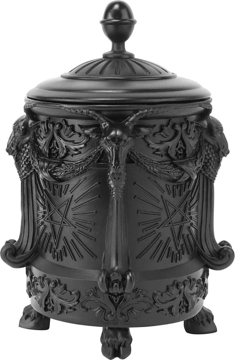 Keep your trinkets and hidden treasures safe with this Baphomet inspired urn. Adorned with intricate details of pentagrams and filigreeΒ and features goat feet and a removable lid.Β