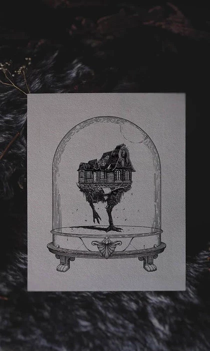 Baba Yaga, from classic Russian folklore. Baba Yaga was said to be a child-eating creature whom lived in a house on chicken legs.