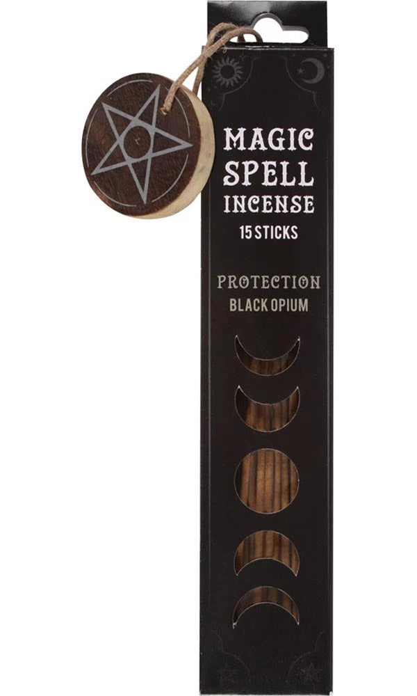 This box of magic spell incense includes 15 opium scented incense sticks and a matching wooden pentagram holder that is perfect for accompanying spells of protection and guidance. Whether used for spell work or everyday enjoyment, this fragrance will attract all things divine.