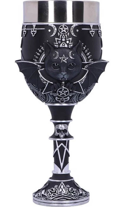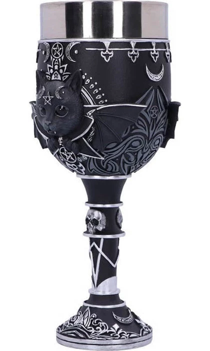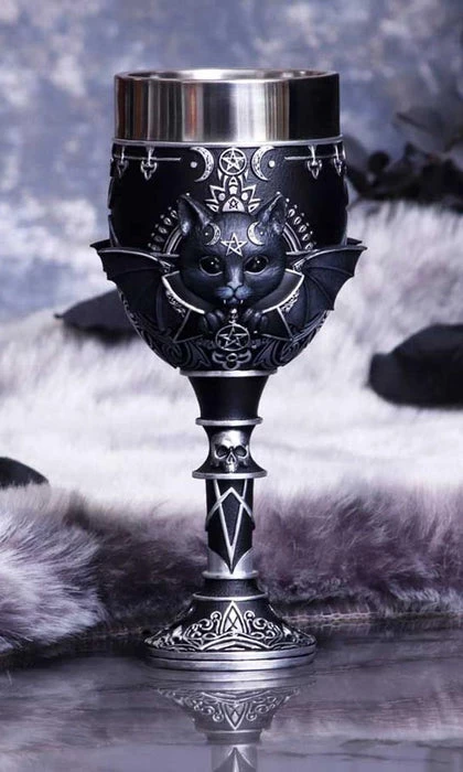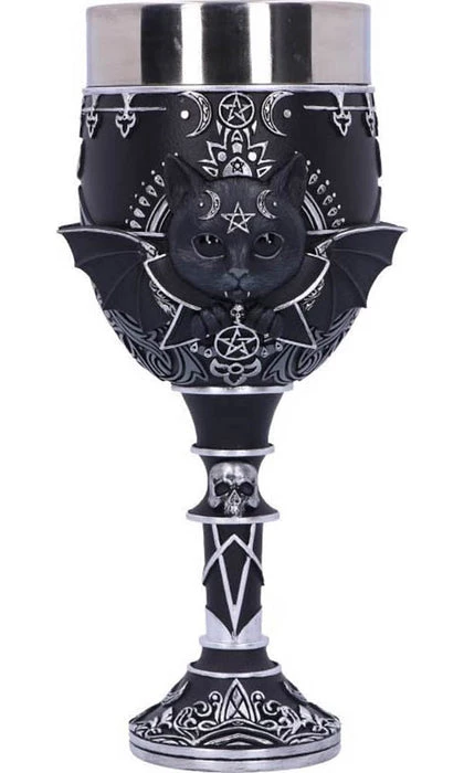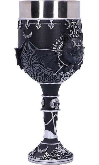 This black cat is the union of good and evil and appears to be a vampire spirit, encapsulated by bat wings protruding from the catโs back. The Goblet is decorated in ornate silver detailing and satanic symbology. Cast in high-quality resin before being expertly hand-painted, this Malpuss Goblet is likely to be the cutest occultist youโve ever seen.
