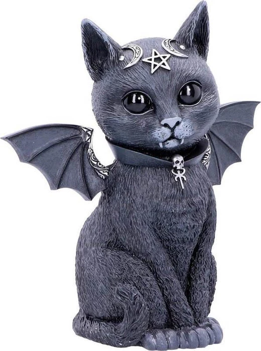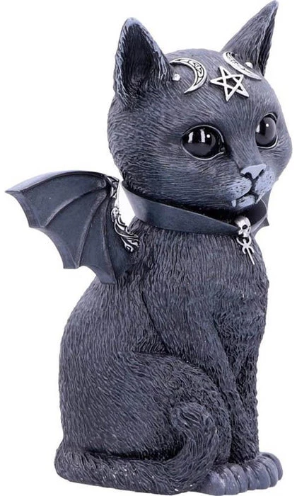 This strange creature is the union of good and evil. As you look into its black eyes you notice that all is not as it seems, darkness resides within. The cat appears to be a vampire spirit, encapsulated by bat wings protruding from its back, and its abnormally large canine teeth. The cat is decorated in ornate silver detailing and occult symbology. Cast in high-quality resin and carefully hand-painted this figurine is likely to be the cutest occultist you’ve ever seen. Alongside the Horned Cat, this amalgamation of horror and delight will make the perfect addition to any feline fanatic’s collection.
