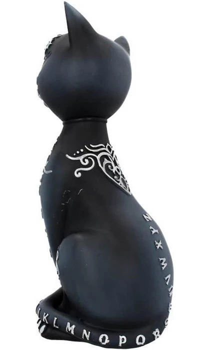 Walk and talk between worlds with the Mystic Kitty. Sitting up, this black cat looks at you inquisitively, large purple eyes portraying a preternatural intelligence. Silver letters and numbers cover their fur, mimicking a spirit board โ the numbers 0 to 9 are down their front legs, โYesโ and โNoโ are written on their knees, and the letters of the alphabet start at the tip of their tail and continue up their back. A baroque heart-shaped planchette design is repeated on their front and their back, and the word โGoodbyeโ appears below the silver pentacle hanging from their collar. A pyramid with an eye in it is picked out on their forehead. Cast in the highest quality resin before being carefully hand-painted, this mysterious feline can add an air of magic to any home.