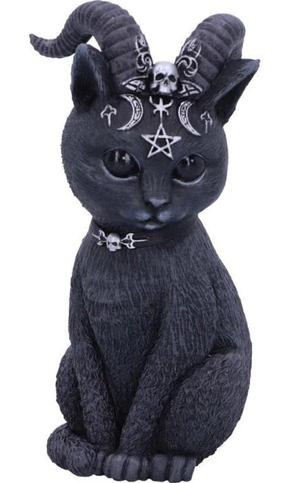 This horned cat is the union of good and evil. The black cat, sits and stares at you adoringly. As you look into its black eyes you notice the darkness that resides. Inside this cat appears to be the spirit of Baphomet, encapsulated by goat horns and satanicย symbology. Cast in high-quality resin and carefully hand-painted this figurine is likely to be the cutest occultist you’ve ever seen.ย