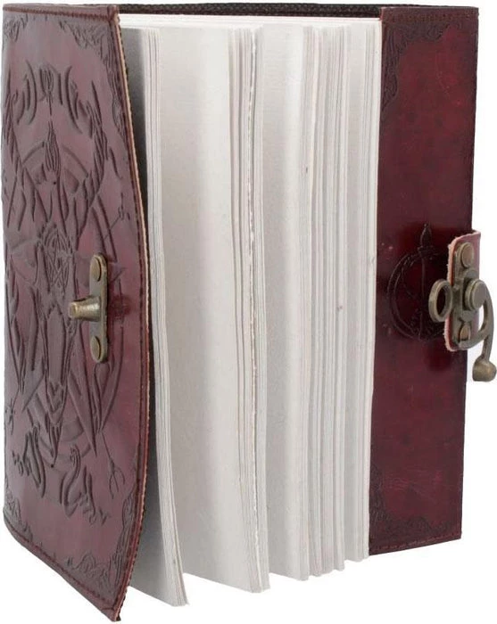 The cover of the journal is decorated with the head of a triple-horned Sabbatic Goat with a pentagram raised from its skull. Underneath the head, there rests a five-pointed pentagram, surrounded by intricate patterns. Above it, a pair of crescent moons sit while below it, the heads of two King cobras are poised to attack.ย This masterpiece is made of high-quality paper and has a leather-bound front cover that features one bronze metal clasp.ย