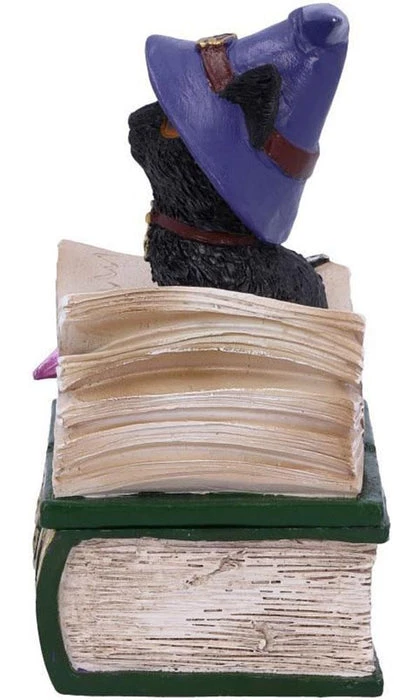 This charming cat figurine is cast in high-quality resin before being painstakingly hand-painted. BinxΒ is feeling playful while sitting inside the pages of an emerald spell book. With a purple Witches hat on his head, he can be lifted to reveal a spacious storage box compartment below, the perfectΒ gift for the charming witch in your life.