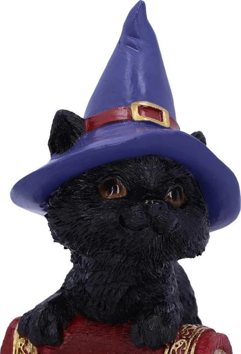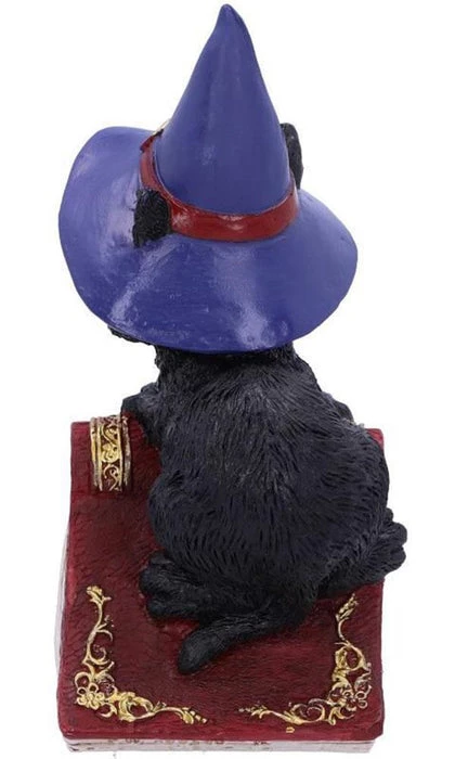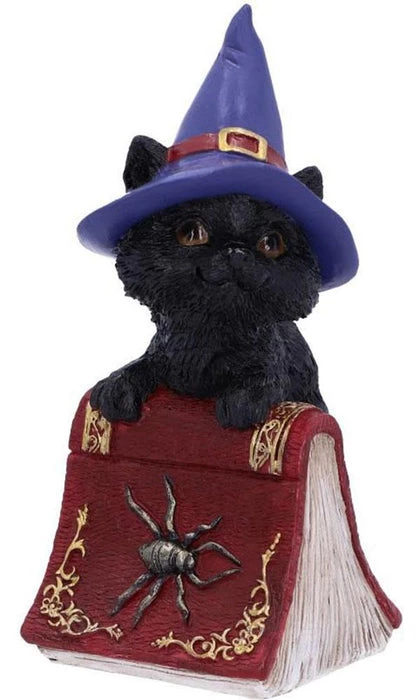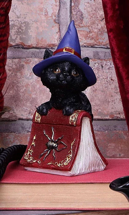 This charming cat figurine is cast in high-quality resin before being painstakingly hand-painted. Hocus is feeling playful whileΒ sitting atop a crimson spell book. With a purple Witches hat on her head and large silvered spider decorating the grimoire, this piece is the perfectΒ gift for the charming witch in your life.