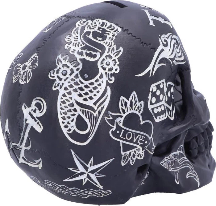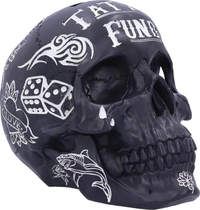 Tattoo Fund (Black): This black skull money box is decorated in a variety of tattoo styles including traditional, tribal and illustrative, all of them coloured in white, in contrast with the black skull Whether you’re saving up for a tattoo or preparing for a rainy day, this skull shaped money box is the best place to store your spare change. Cast in the finest resin before being meticulously hand-painted, this piece is the perfect addition to any alternative home.