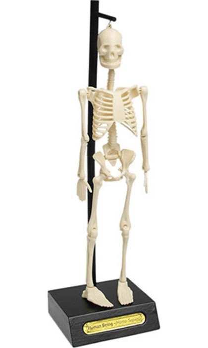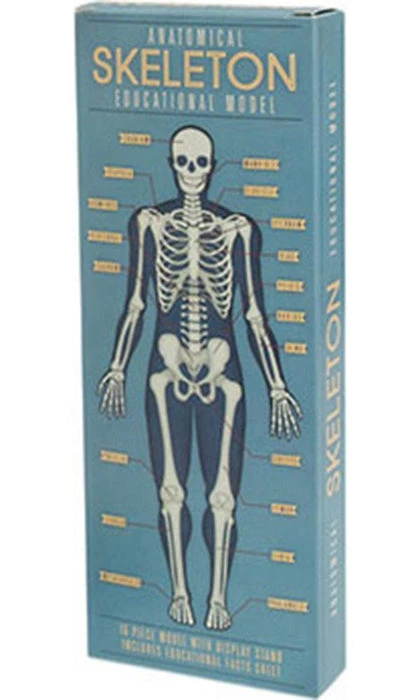 Anatomical Skeleton Model for your desktop. This 16-piece educational model stands upright and is a valuable resource for you to learn the major bones in the human body. Includes wooden stand and colouring sheet with lots of interesting facts about the human skeleton.