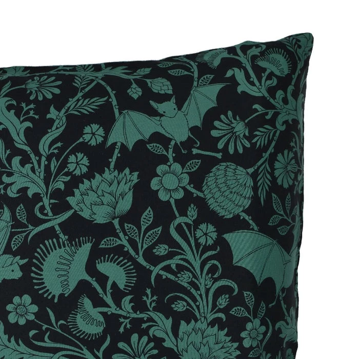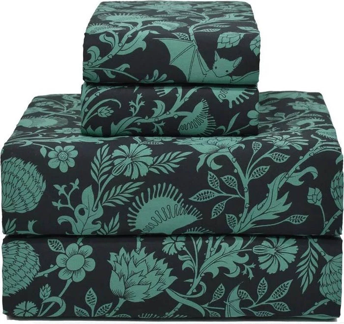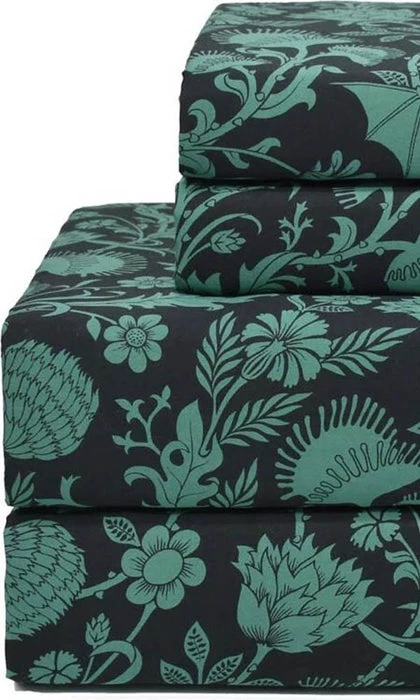 Bring your love of a moonlight stroll into your bedroom with Elysian Fields in a new shade: Absinthe green. Frisky little bats flutter among the graceful thistles and Venus flytraps on these dreamy sheets made from long staple cotton. Spruce up your bed with floral linens that are far from the usual. Just like you.ย ย