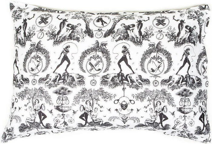 Take a walk on the wild side! The Fetish al Fresco toile print is a pastoral landscape of colonial scenes that will dominate your dreams. At first glance this Victorian toile is a traditional classic, but look closer and you’ll see the scene is at her beck and toile. If you like to play in bed, then it’s time to beg for these pillow cases.