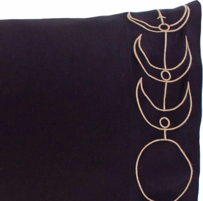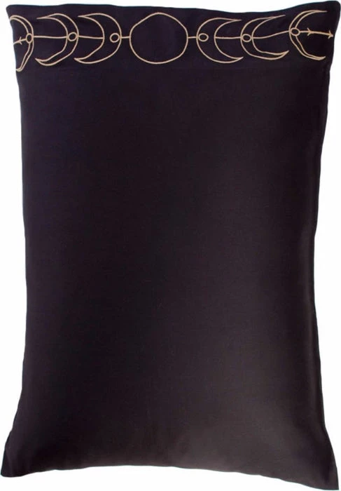 The hems of these black pillow cases are adorned with a gold tone embroidered design of the moon phase.