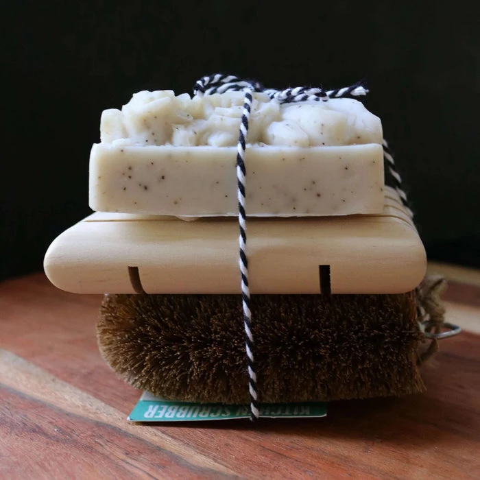 Everything you need to get started with eco-friendly solid dish soap. The gift set includes a full-sized Dish Magic, Wooden Soap Dish, and an ECO Max Kitchen Scrubber neatly wrapped in black and white cotton twine.