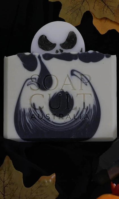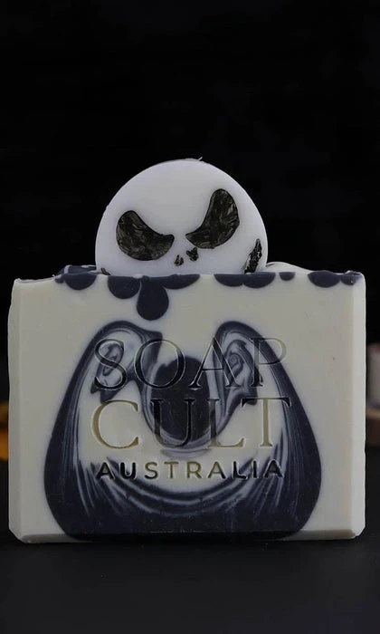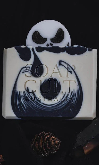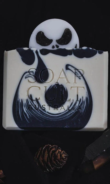 Halloween Town’s famous King, Jack Skellington is back again this Halloween! This soap has a hand-painted Jack face + a swirled black and white design, inspired by his pinstripe suit.