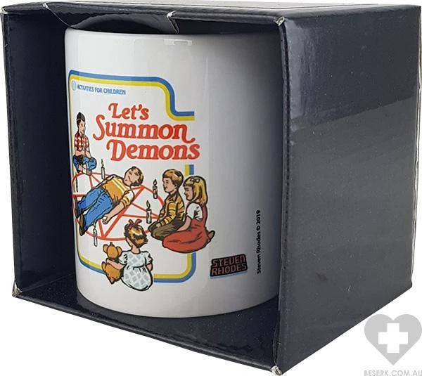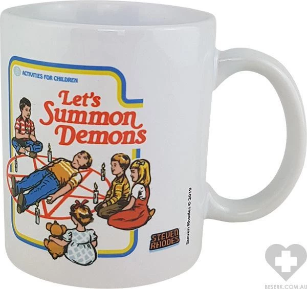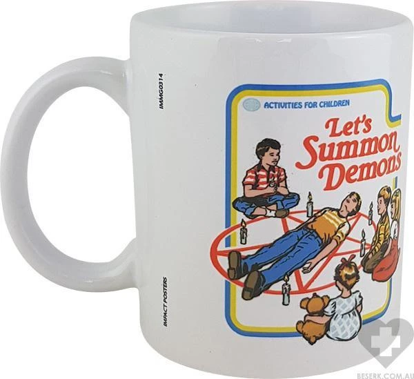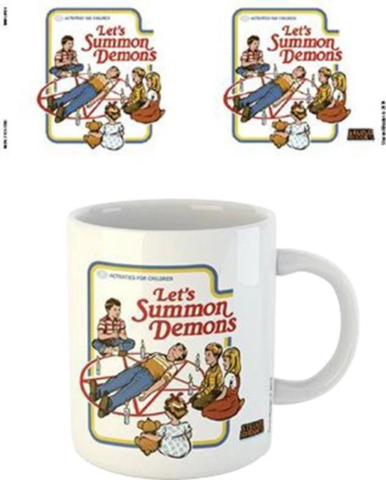 Ceramic mug with print featuring children attempting to summon demons with a summoning circle.ย