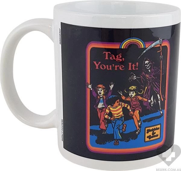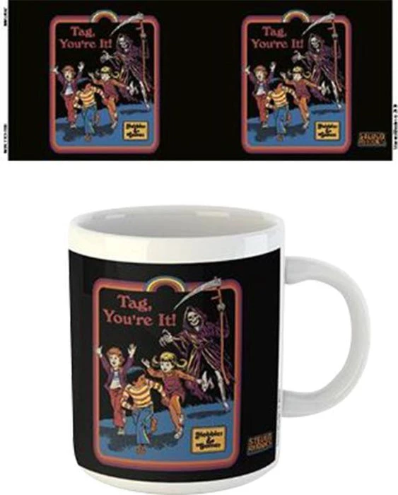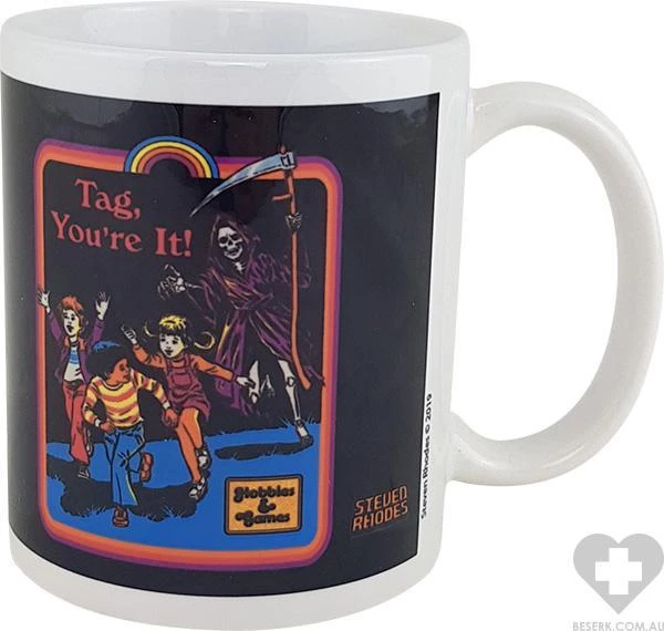 Ceramic mug with print featuring children being chased by Death, while having a game of tag… Or is it just a game?